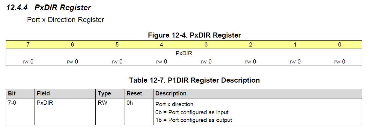 PxDIR 레지스터는 입/출력 방향을 설정하는 레지스터이다. LED를 켜고 끄려면 출력으로 설정해야하므로 PxDIR 레지스터에 내가 설정하고자 하는 핀 번호(0~7)를 보고 1로 설정한다