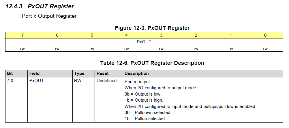 PxOUT 레지스터는 각 핀의 출력상태를 관장한다. 0이면 Low, 1이면 High 상태가 된다.