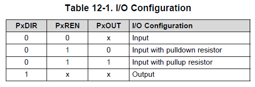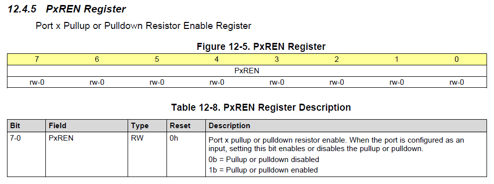 버튼 입력을 확인하기 위해서는 PxDIR이 입력으로 되어있어야하고, 내부 풀업/풀다운 저항을 사용할지 안할지 설정해주어야 한다. PxPEN 레지스터를 통해 설정 가능하다.
