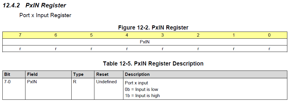 PxIN 레지스터는 현재 핀의 상태를 읽어오는 레지스터이다.