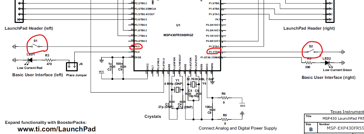 런치패드 회로도를 보면 2개의 푸시버튼 스위치가 있고 각각 P1.1, P4.5에 연결되어 있음을 알 수 있다.