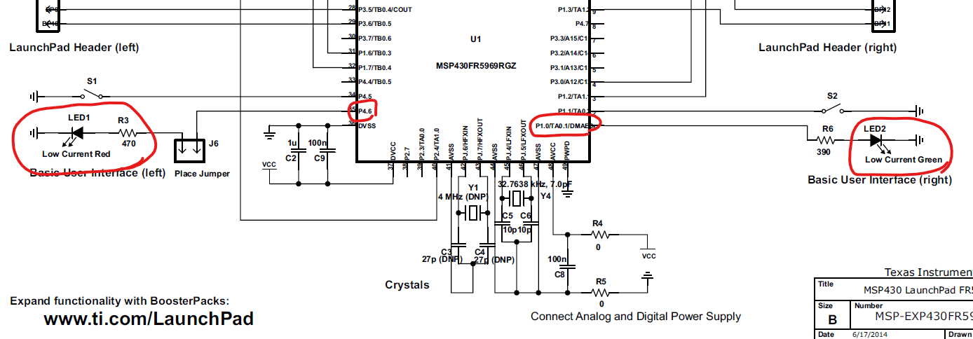 먼저 MSP430FR5969 런치패드에 연결되어 있는 LED부터 살펴보자.